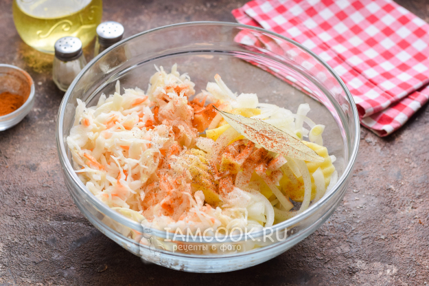 Переложить в большую миску картофель, квашеную капусту, лавровый лист и специи, растительное масло. Перемешать все ингредиенты.