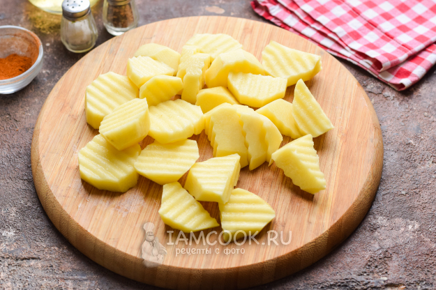 Картофель очистить и вымыть, просушить. Нарезать картофель небольшими кусочками. Если картофель мелкий, его просто разрезать пополам.