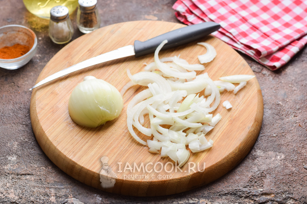 Очистить лук, сполоснуть и просушить. Нарезать лук полукольцами.