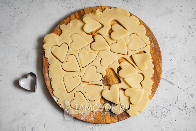 Меньшую часть теста достанем из холодильника, раскатаем в тонкий пласт, вырубкой для печенья в виде сердечка вырежем сердечки из теста.