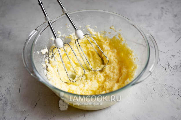 Миксером будем взбивать эти ингредиенты до кремообразного состояния. Вобьем яйцо и продолжим взбивать до полного объединения ингредиентов.
