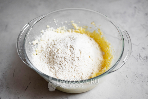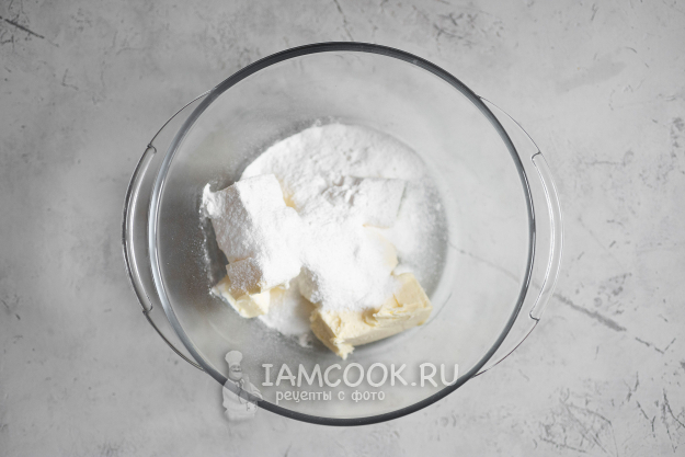Приготовим тесто. В миску выложим мягкое масло и добавим сахарную пудру.