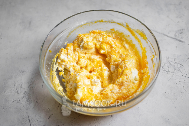 К пюре добавим рикотту, крахмал и сахарную пудру.