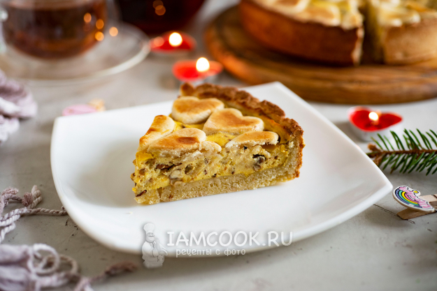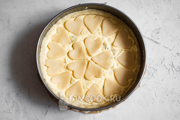 Выложим в форму поверх начинки все сердечки из теста. Выпекать песочный пирог с тыквой и грецкими орехами будем в заранее разогретой до 180 градусов духовке 40-45 минут.