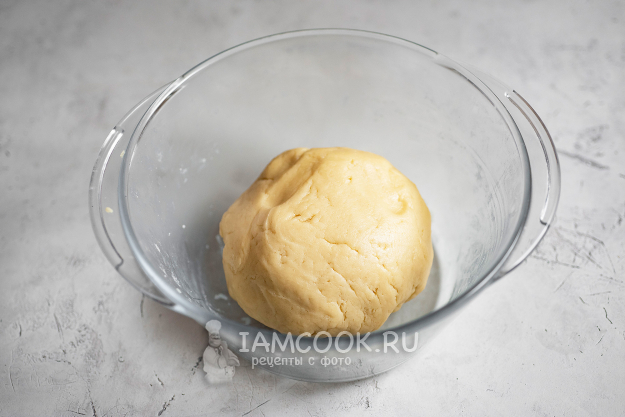 Замесим мягкое тесто, которое не прилипает к рукам. Тесто делим на 1/3 часть и на 2/3 части. Меньшую часть оборачиваем пищевой пленкой и до момента использования отправляем в холодильник.