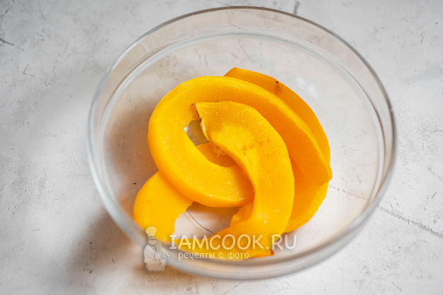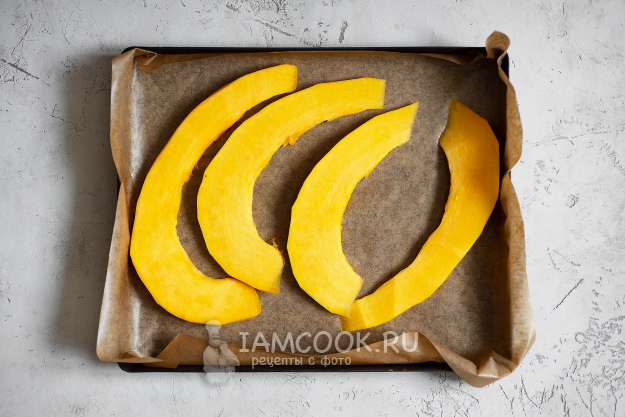 Нарежем тыкву тонкими ломтиками и выложим на противень, застеленный пергаментом для выпекания. Запекать будем 10 минут, до мягкости, при температуре 180 градусов.
