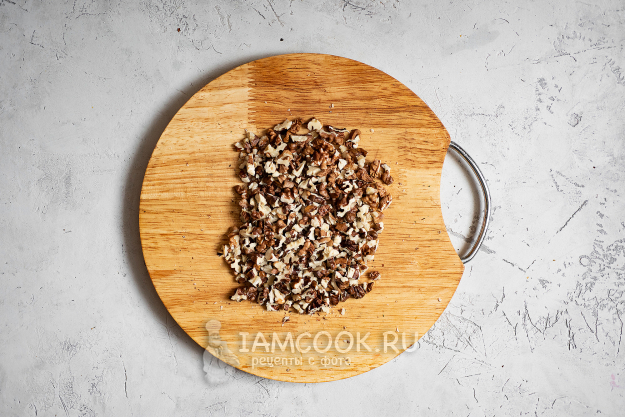 Ядра грецких орехов нарежем ножом на маленькие кусочки.