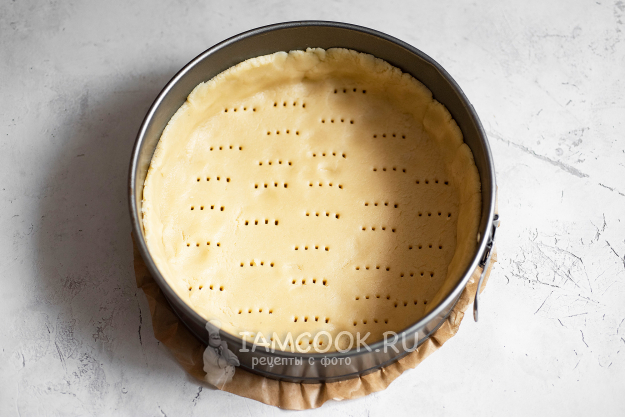 Большую часть теста выложим на дно формы, застеленной пергаментом для выпекания, и сформируем основу с бортиками высотой 4 см. Горизонтальную часть теста наколем вилкой. Форму с основой отправим в холодильник на 15 минут.