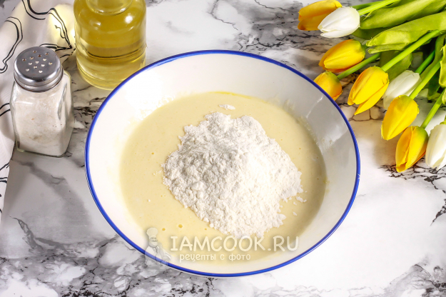 Затем всыпьте пшеничную муку высшего сорта. Ее может понадобиться чуть больше, если яйцо крупное. Вмешайте муку в жидкую массу. По желанию можно добавить ванильный сахар или молотую корицу, цедру лимона либо апельсина.