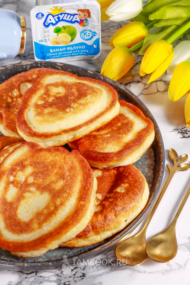 Выложите аппетитные оладьи из творожка «Агуша» на тарелку и подайте к столу теплыми, не забывая про сладкие соусы, варенье, сметану или сгущенное молоко.