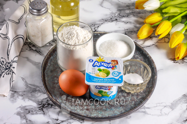 Возьмите необходимые ингредиенты для приготовления оладий из детского творожка «Агуша» с золотистой корочкой.