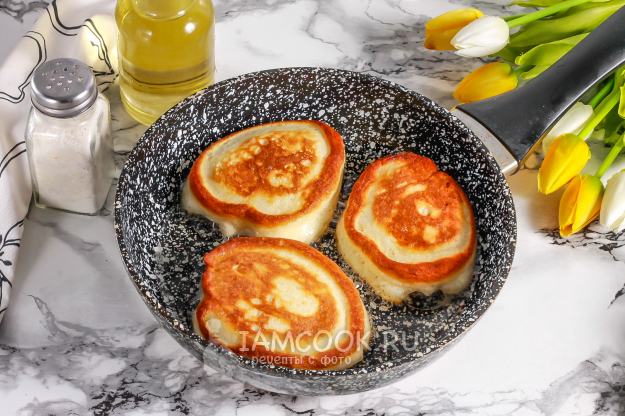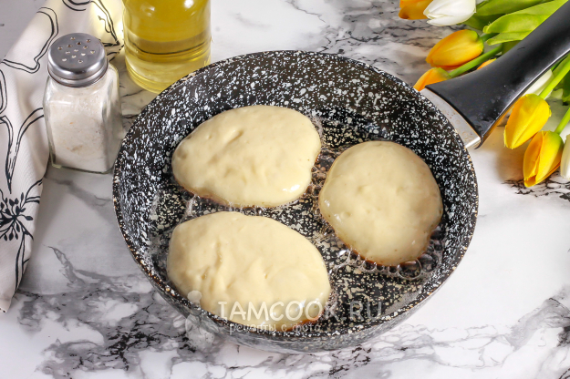 Влейте растительное масло на сковороду и прогрейте его. Затем нагрев убавьте до умеренного и выкладывайте по 1 ст.л. теста в сковороду, слегка разровняйте. Обжаривайте примерно 1 минуту. Следите за низом оладий, так как снизу они уже подрумянятся, а сверху будет сырое тесто.
