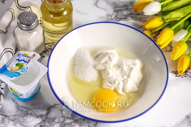 Выложите творожок в глубокую тарелку или миску, вбейте туда же куриное яйцо и всыпьте сахарный песок, соль. Тщательно взбейте все венчиком или вилкой примерно 2 минуты.