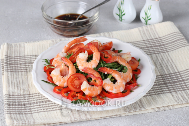 Выложить на листья руколы половинки помидоров черри и креветок.