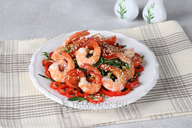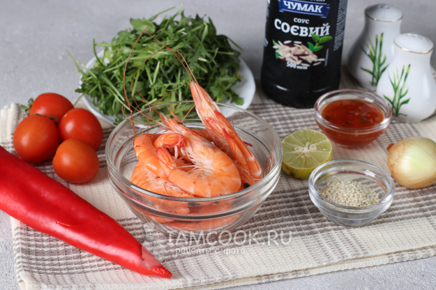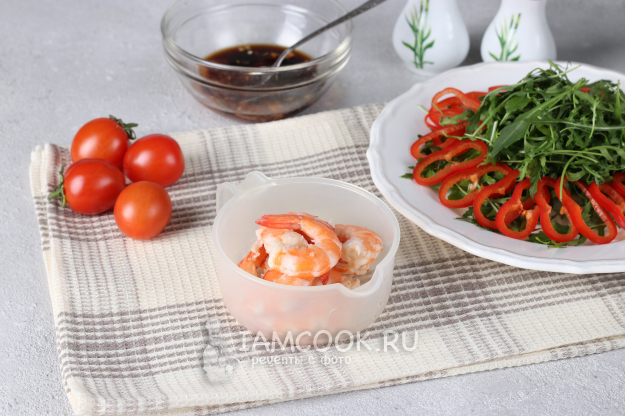 Подготовить по списку ингредиенты для тайского салата с креветками и руколой.