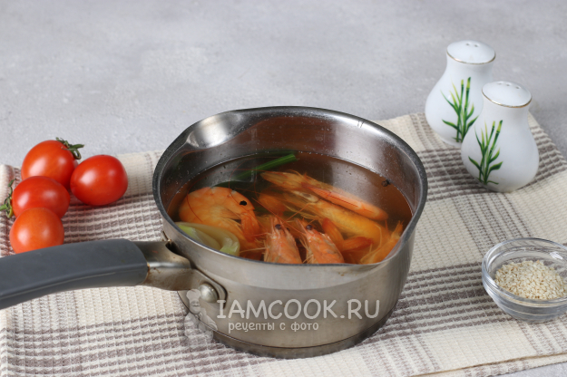 Креветок вынуть из бульона, почистить.