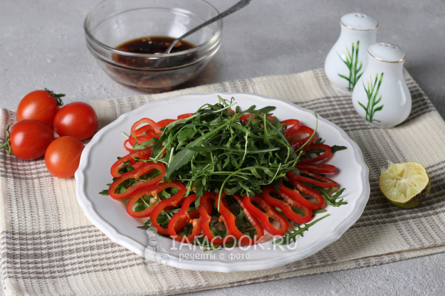 На плоскую тарелку выложить кольца репчатого лука, затем горкой выложить руколу. Колечки перца выложить сверху. Руколу можно дополнительно сбрызнуть соком лайма.