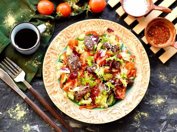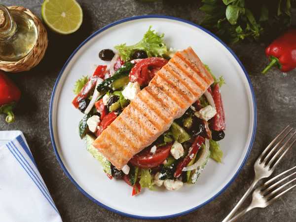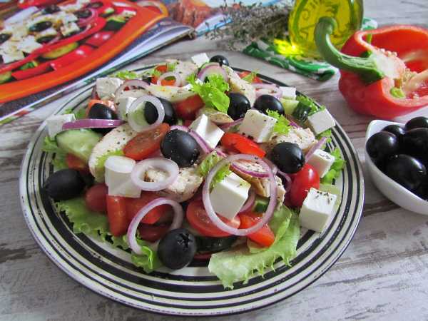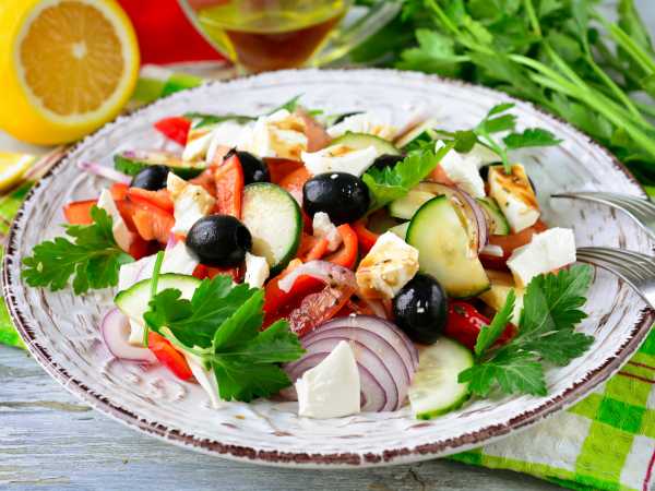 Готовый Греческий салат с соевым соусом сразу подавайте к столу. Блюдо очень вкусное и ароматное. Украшайте закуску любой свежей зеленью.