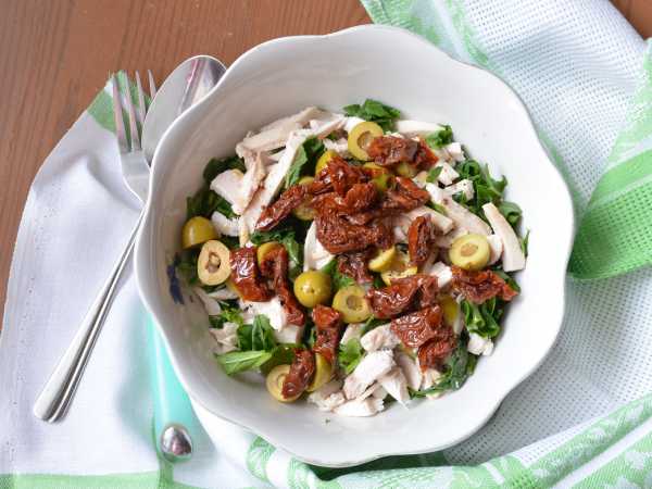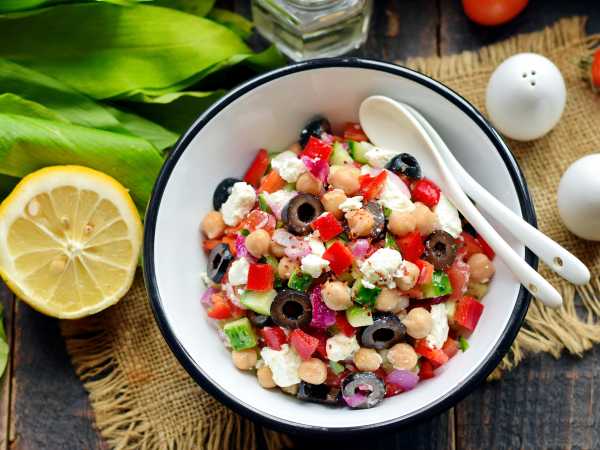 Добавьте маслины без косточек и раскрошите сыр Фета (или нарежьте сыр кубиками).