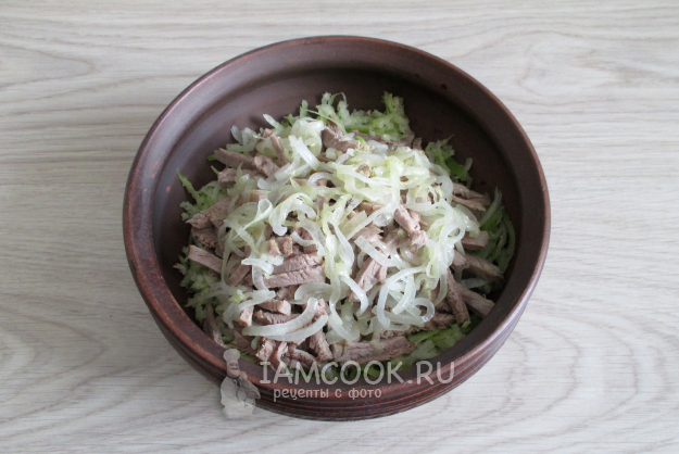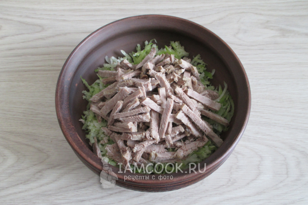 Отварную остывшую говядину нарежьте соломкой/брусочками.