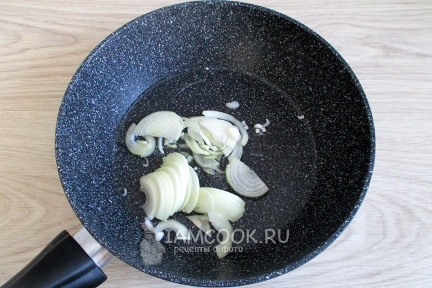 Лук нашинкуйте тонкими полукольцами и обжарьте на сковороде на подсолнечном или на сливочном масле до зарумянивания при помешивании минут пять на среднем огне. Мне нравятся оба варианта, а вы выбирайте масло для жарки на свой вкус. Слегка посолите.