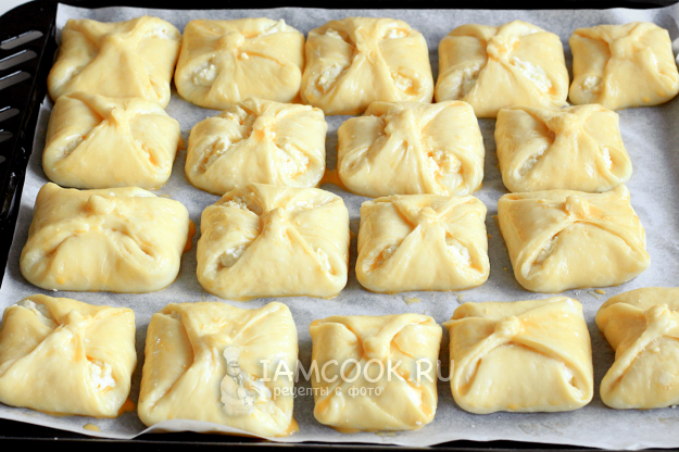 На каждый квадратик теста выложите столовую ложку начинки и защипните углы теста крест-накрест. Очень тщательно скрепляйте края, чтобы при выпечке тесто не разошлось.