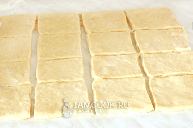 Когда тесто подойдет, можно сделать еще одну обминку, но если торопитесь, то начинайте работать в этим тестом. Раскатайте его на столе и нарежьте на равные квадраты. Может получиться от 12 до 16 квадратов, в зависимости от их размера.