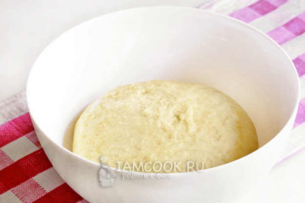 Смажьте руки растительным маслом, чтобы легче было замешивать тесто. Обязательно вымешивайте тесто минут 10, не меньше, чтобы оно стало гладким и перестало прилипать к рукам и столу. Накройте миску пленкой и уберите в теплое место без сквозняков для подъема (1 час).