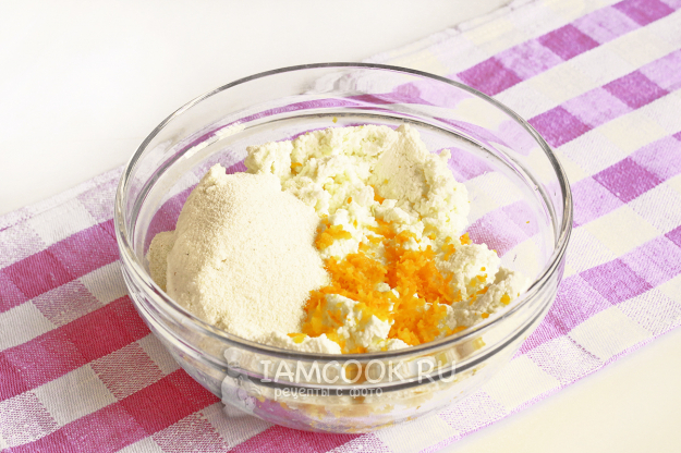 Для начинки лучше брать гладкий, пастообразный натуральный творог, но не творожный продукт. Если он суховат, то добавьте к нему сметану, если творог нормальной влажности, то сметана не понадобится. Смешайте творог с цедрой лимона, манкой и лимонным соком. Можно пробить начинку блендером, чтобы она стала еще более воздушной, но я этого не делала. Заметьте, сахар в творог не добавляем, он будет добавлен вместе с белками.