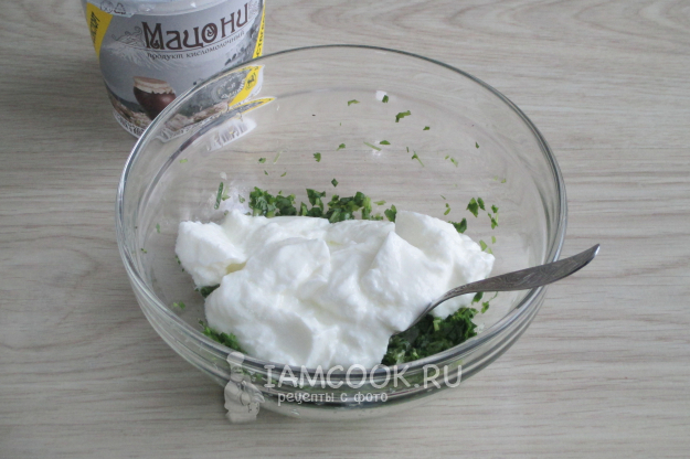 Для варианта соуса из мацони с чесноком и зеленью подготовьте ингредиенты по списку к рецепту.
