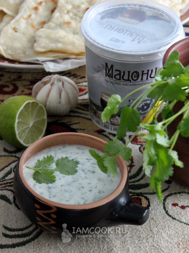 В этот раз готовила соус из мацони к кутабам с курицей, очень понравилось. У меня сочетание куриного мяса и кинзы не вызывает противоречий, например, блюдо грузинской кухни Чакиндзули.
