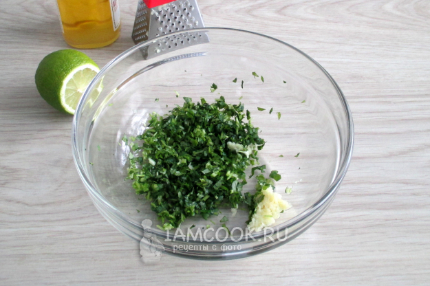 Чеснок измельчите (мелкая терка, пресс и т.п.). Перемешайте зелень кинзы, чеснок, сок лайма, (белое сухое вино) и растительное масло (в этом варианте - 1 ч.л. кунжутного).