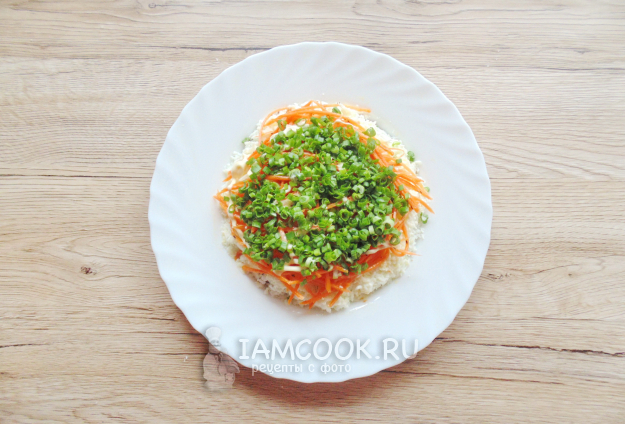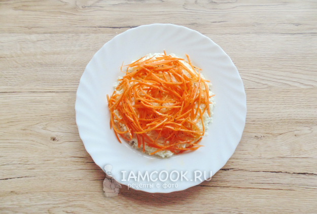 Морковь по-корейски выложите следующим слоем салата. Также покройте её майонезом.