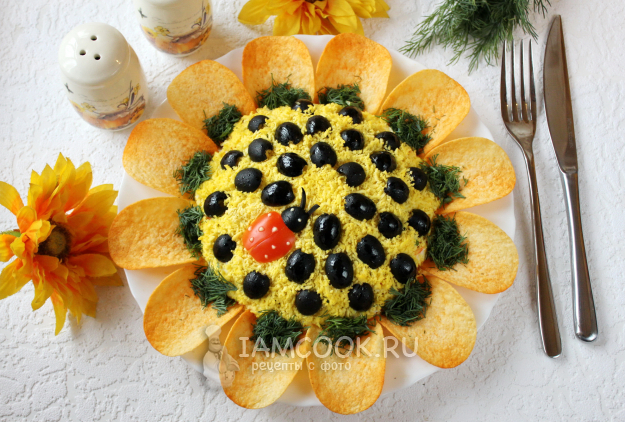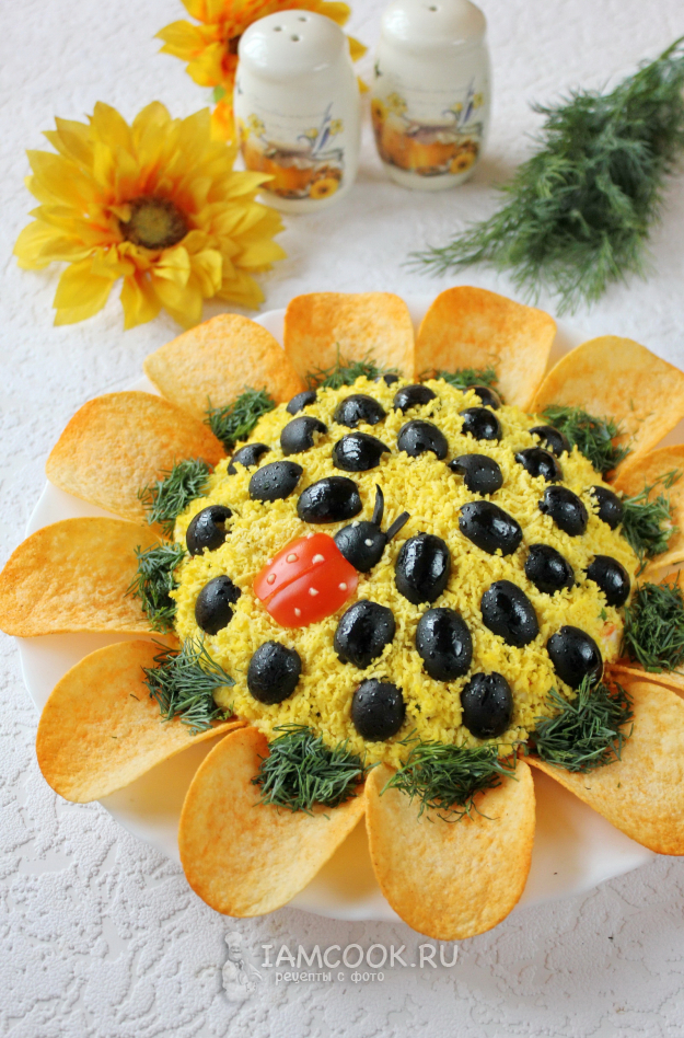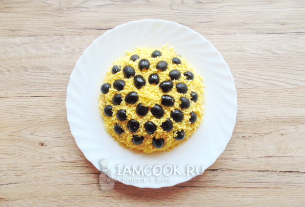 Эффектный и вкусный салат «Подсолнух» с корейской морковью готов - подавайте на праздничный стол.