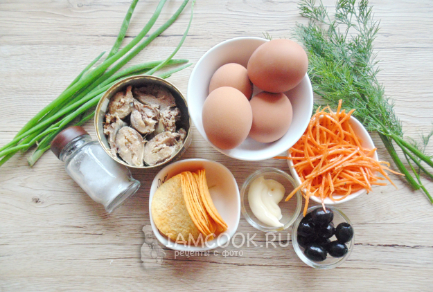 Для приготовления салата «Подсолнух» с корейской морковью возьмите все ингредиенты по списку.