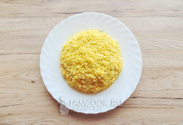 Желтки яиц натрите на терке и покройте весь салат.