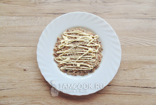 Консервированную сардину достаньте из банки и разомните вилкой. Выложите первый слой салата на большую тарелку. Покройте рыбу сеточкой из майонеза.