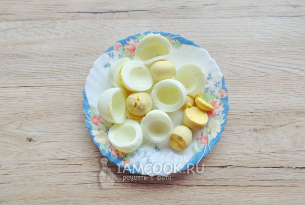 Яйца сварите вкрутую. Залейте холодной водой, остудите и очистите. Разделите белки и желтки.