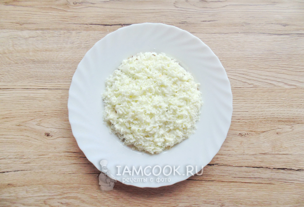 Белки натрите на терке и выложите вторым слоем салата. Покройте майонезом.
