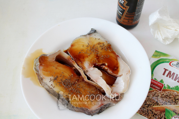 У меня стейки трески, можно взять филе. Рыбу хорошо промываем, промакиваем досуха бумажным полотенцем и заливаем соевым соусом. Щедро посыпаем семенами тмина. Рыбу обмакиваем в маринад со всех сторон, переворачиваем пару раз в течение получасового маринования (можно дольше, в этом случае нужно поставить рыбу в холодильник).