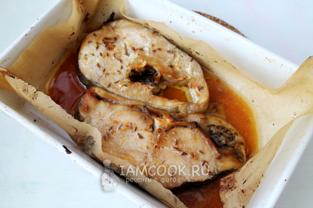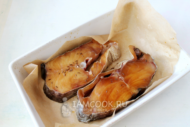После маринования треску снова промакиваем полотенцем, уже от маринада. Выкладываем стейки на промасленный пергамент и укладываем в форму.
