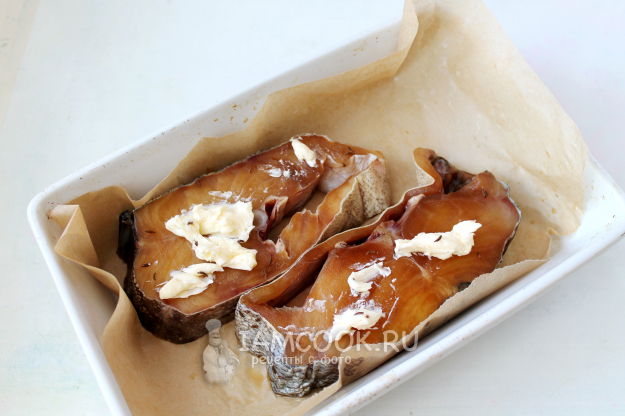 Сверху кладем мягкое сливочное масло, оно в процессе запекания будет проникать в мякоть рыбы, и она получится сочной.