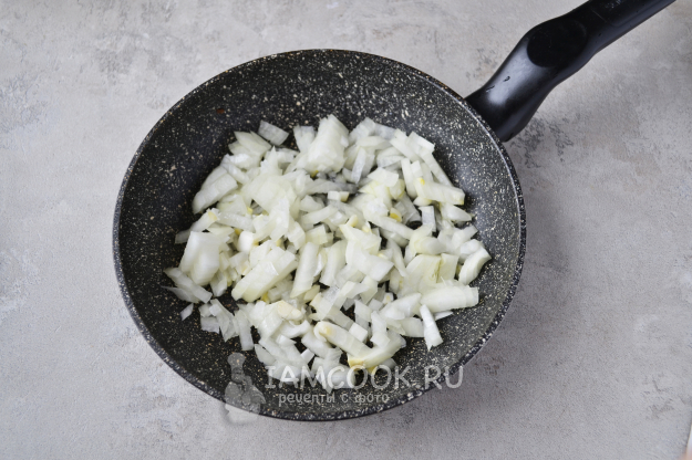 Лук очистите, мелко нарежьте и отправьте на разогретую с растительным маслом сковороду.