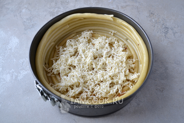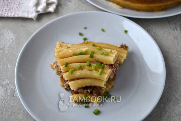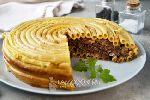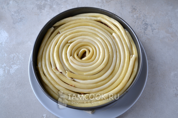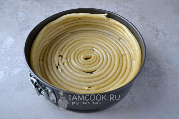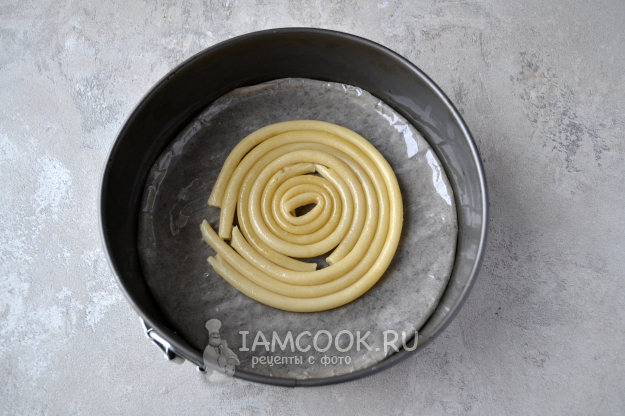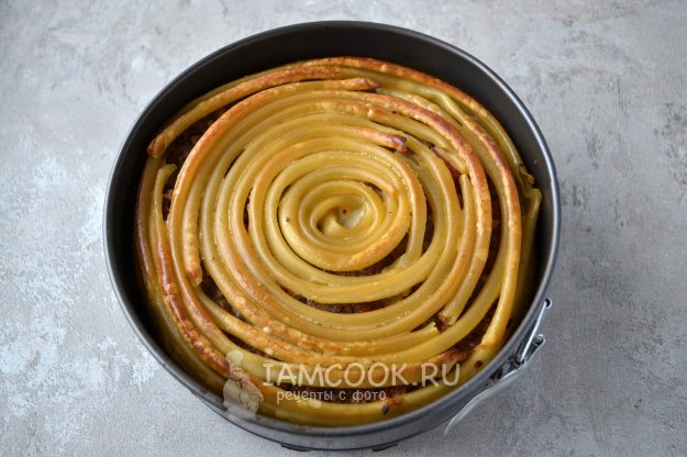 Круглую форму для запекания смажьте растительным маслом и начните укладывать макароны по спирали, начиная с центра формы. У меня не было подходящей формы для запекания, поэтому я воспользовалась разъёмной формой.