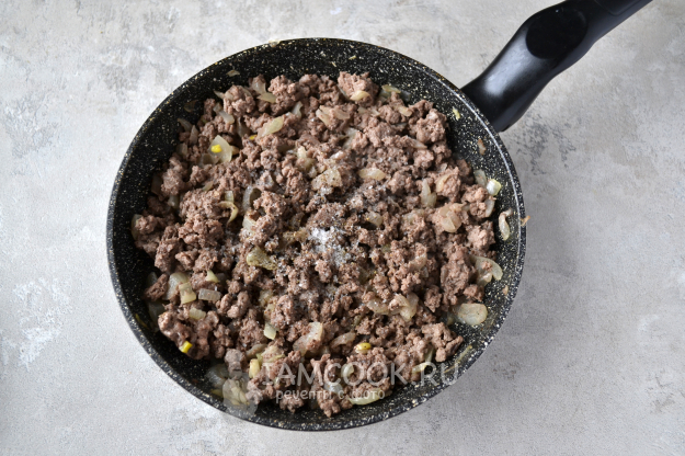 Обжаривайте фарш почти до готовности. Посолите и посыпьте черным молотым перцем.