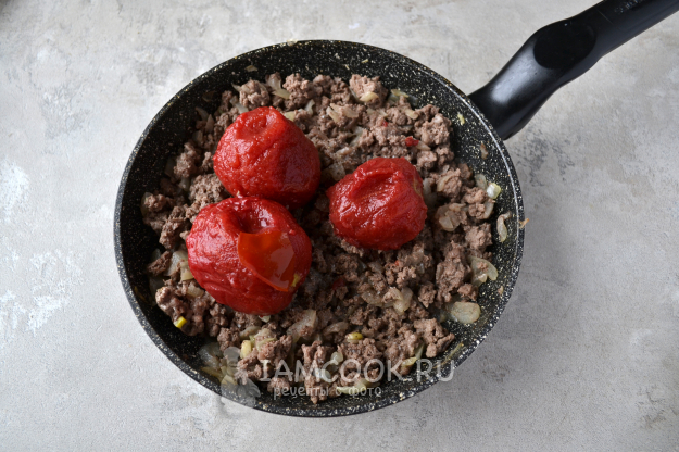 Добавьте к фаршу маринованные помидоры без шкурки и еще обжаривайте 7-8 минут на умеренном огне.