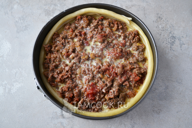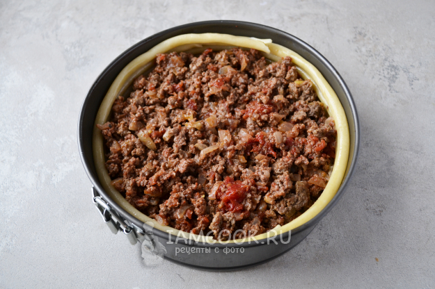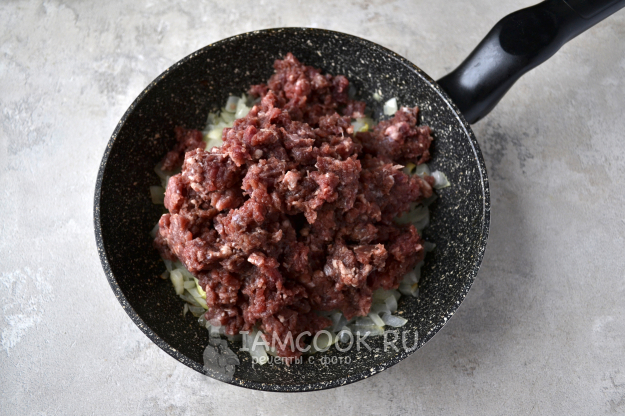 Положите в сковороду фарш. Сразу же силиконовой лопаткой разбейте его, чтобы он не превратился в один сплошной комок.