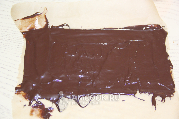 Приготовить шоколадный декор. Шоколад растопить и нанести на пергамент, разровнять лопаткой или шпателем. Слой шоколада должен быть не очень тонкий!