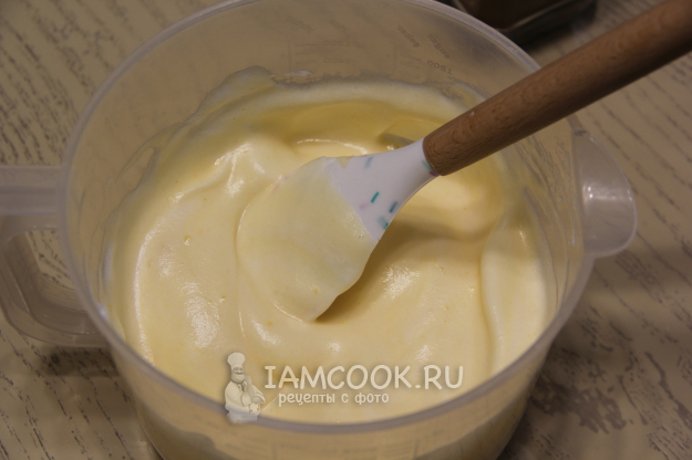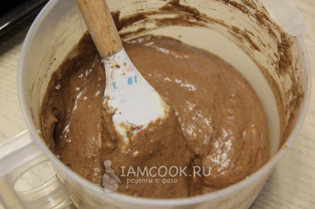 Перемешать тесто лопаткой движениями сверху вниз. Тесто получится не густым и воздушным.