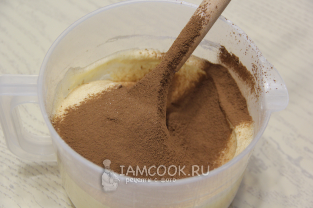 Всыпать просеянную муку, какао, разрыхлитель и добавить соль.
